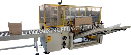 本機(jī)將疊成紙板的箱子自動(dòng)打開(kāi),箱子底部按一定程序折合,并用膠帶密封,可單獨(dú)使用,也可與裝箱機(jī)連線(xiàn)使用。廣泛應(yīng)用于食品,化工,日用品等行業(yè)。
